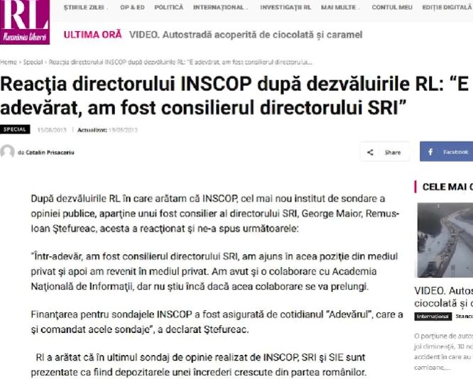 "Domnul Orlando Nicoară de la news.ro comandă aceste sondaje la domnul Ștefureac la INSCOP, care este finul lui Maior, a fost și consilierul lui, dar și un apropiat al lui Mircea Geoană. Mai mult, este și doctorand la Academia "Mihai Viteazul" a SRI, după ce în trecut a și predat acolo.