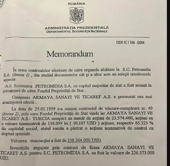 Sursă: Memorandum privatizare Petromidia - Realitatea PLUS/Culisele statului paralel