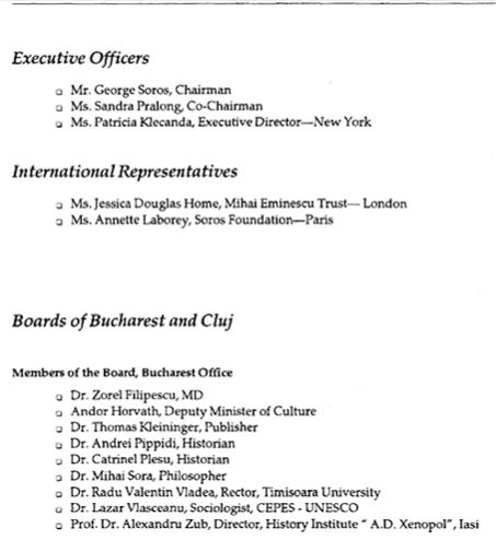 De exemplu, doar pentru o întâlnire Fundația Soros a plătit 275 de dolari cheltuieli de călătorie, plus diurne de 50 de dolari pentru Catrinel Pleșu, Alexandru Lăzescu, Stelian Tănase și Călin Anastasiu.