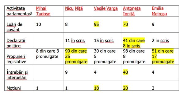 Social-democratul Nicu Niță, ales deputat de Brăila, pare să se bucure de cele mai multe propuneri legislative(n.r. 90 de propuneri) din care, promulgate în legi au fost 25. La acest capitol îl urmează Emilia Meiroșu cu 51 de propuneri, din care 17 au fost transformate în legi.